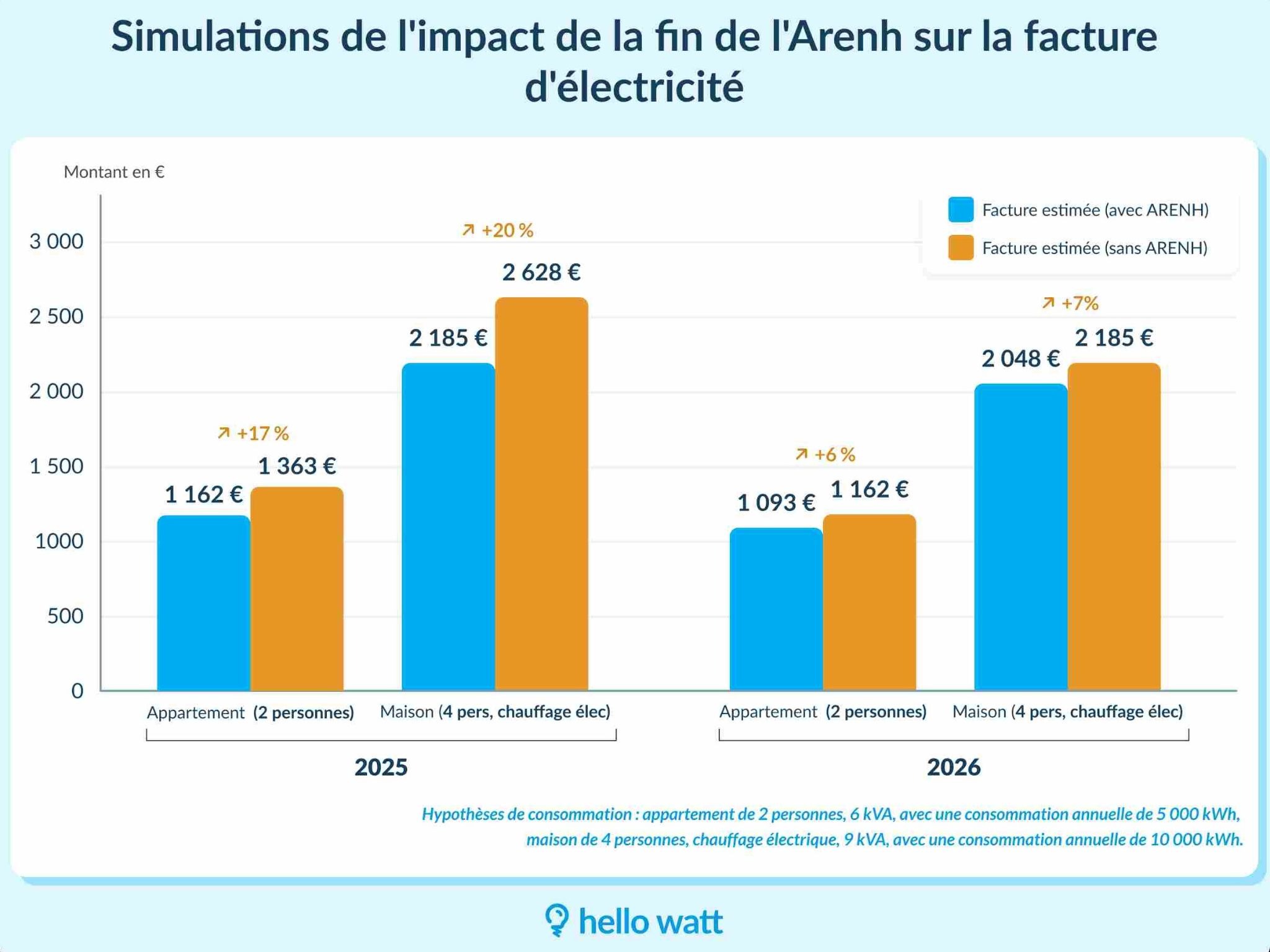 Selon les calculs d'Hello Watt, le maintien de l’ARENH aurait permis une réduction de 9 % du prix HT du kWh du TRVE (tarif réglementé de vente de l’électricité), se traduisant par une baisse de 6 % de la facture TTC. Au lieu de cette diminution attendue, la Commission de Régulation de l'Énergie (CRE) annonce une simple "stabilité" des tarifs.