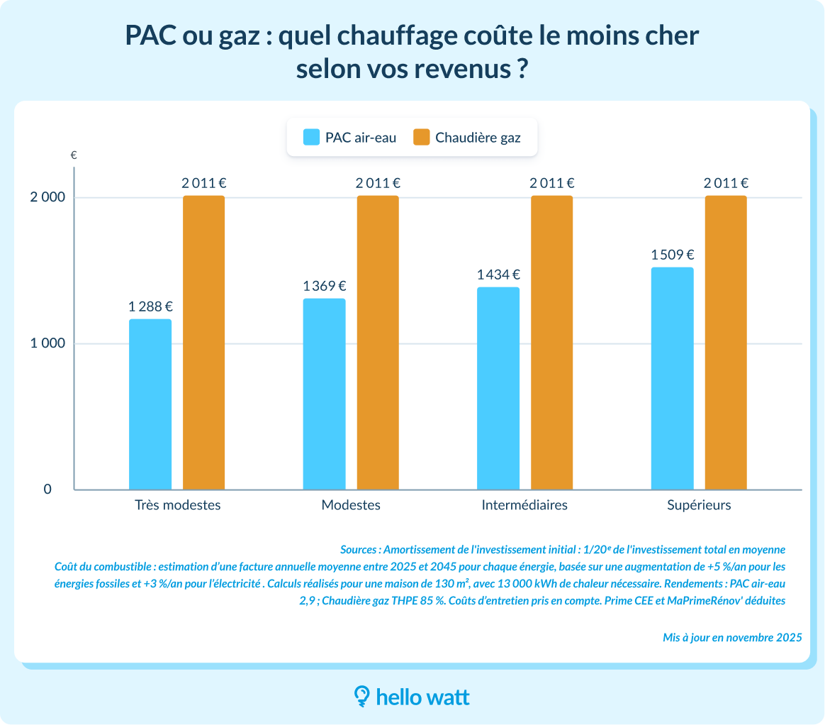 Notre analyse comparative d’une PAC air-eau avec une chaudière gaz réfute l'argument selon lequel une pompe à chaleur ne serait rentable qu'avec des aides conséquentes. Or, même avec un niveau d'aides minimal, elle demeure le mode de chauffage le plus économique à long terme, quel que soit le niveau de revenus du foyer et les aides perçues.