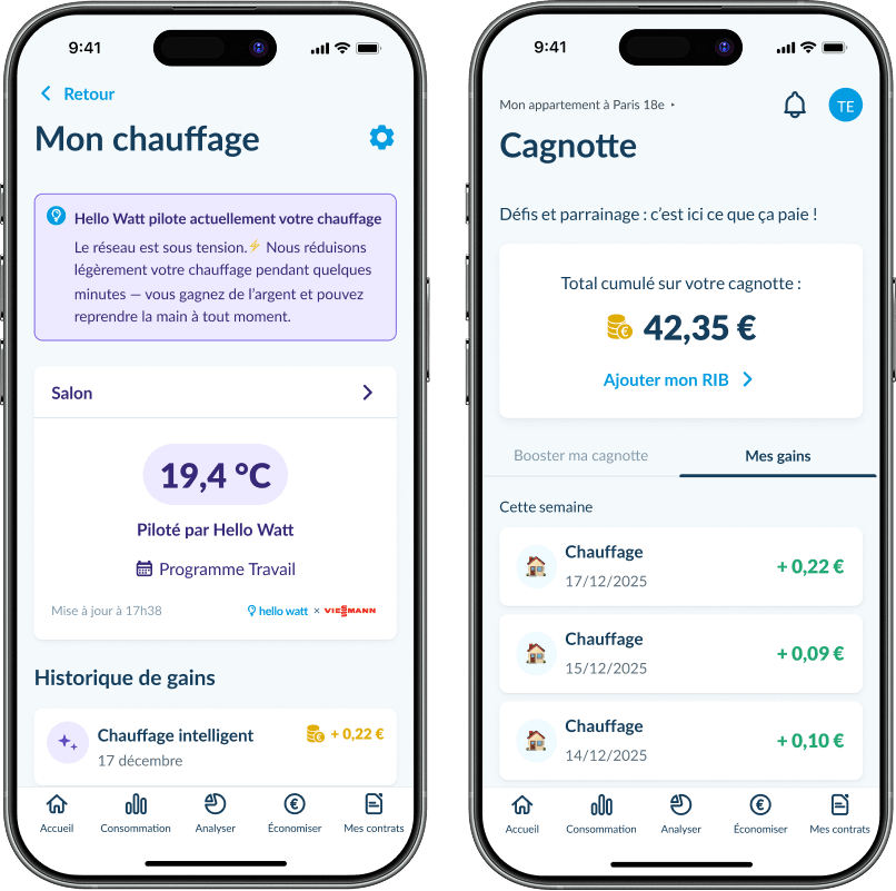 En contrepartie de votre flexibilité, RTE (Réseau de Transport d'Électricité) vous rémunère. Une récompense que vous retrouvez automatiquement créditée sur votre cagnotte Hello Watt.