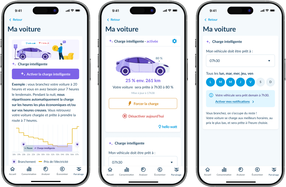Et surtout, vous pouvez désormais activer la charge intelligente, une fonctionnalité exclusive développée par Hello Watt. Son principe ? Vous laissez l’app optimiser pour vous la charge de votre véhicule :