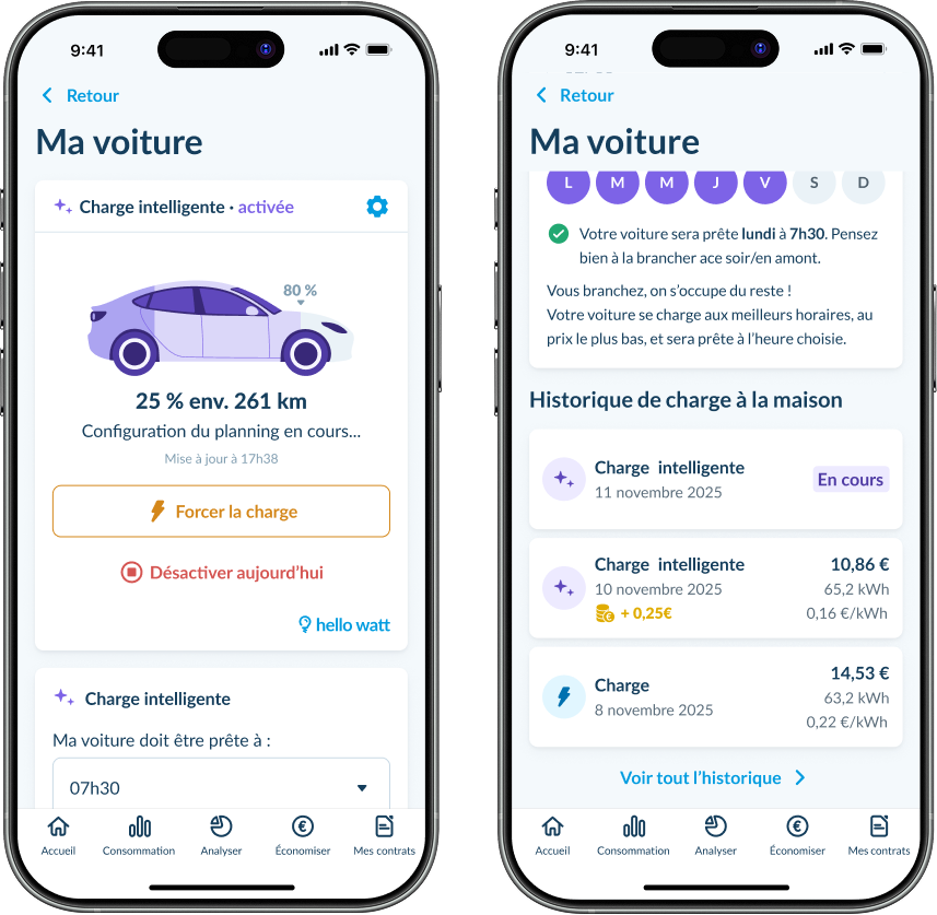 Voici la marche à suivre pour activer la charge intelligente dans l’application Hello Watt (téléchargeable sur l'App Store ou le Google Store) :