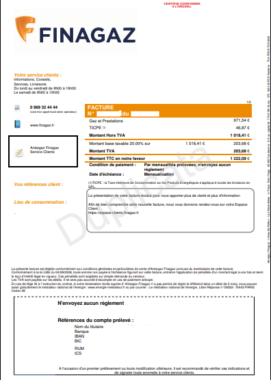 Abonné à l’offre de gaz propane en citerne de Finagaz, vous êtes satisfait de votre contrat, mais vos factures ne vous semblent pas toujours claires. En effet, certaines rubriques sont floues et vous ne parvenez pas à trouver les éléments que vous recherchez. Par ailleurs, le montant qui est demandé par le fournisseur ne vous paraît pas justifié, vous souhaitez le comprendre ou porter une réclamation auprès de Finagaz. Découvrez dans cet article tous les éléments pour comprendre vos factures Finagaz, pour ne pas rater d’échéance de paiement, ainsi que les indications pour contacter facilement le fournisseur ! Retrouvez votre facture chez AntargazLes clients Finagaz peuvent retrouver leurs factures dans leur espace client Antargaz. La marque Finagaz a disparu en octobre 2019. Sommaire Comment lire ma facture Finagaz ? Délai et règlement des factures Finagaz Adresser une réclamation à Finagaz : les démarches à suivre Comment lire ma facture Finagaz ?VOS RÉFÉRENCES CLIENT FINAGAZVous retrouverez dans cette première rubrique les éléments vous permettant d’être identifié comme client Finagaz, en particulier votre référence client. C’est un élément indispensable à conserver pour tous vos échanges avec le fournisseur. Vous y retrouverez aussi des informations propres à votre abonnement (le nom du titulaire du contrat, l’adresse e-mail associée, l’adresse de consommation et l’adresse de facturation). Notez que ces adresses peuvent être différentes si votre contrat de gaz propane en citerne concerne un logement autre que votre habitation principale, ou si vous souhaitez recevoir vos factures à une autre adresse.CONTACTER LE SERVICE CLIENT FINAGAZUne rubrique détaille les différents moyens de contacter votre service client. Vous avez la possibilité de joindre un conseiller Finagaz au 09 69 32 44 44 (numéro non surtaxé). Vous pouvez également joindre le fournisseur depuis votre espace client en ligne complétant un formulaire. Enfin, sur votre facture, vous pouvez trouver une adresse qui correspond au bureau commercial auquel votre adresse est rattachée.LE MONTANT À PAYER À FINAGAZDeux factures vous sont envoyées par Finagaz : une pour la livraison de gaz et l’autre pour l’abonnement. Si vous choisissez le forfait Quiétude, l’abonnement annuel couvre la maintenance et l’entretien de la citerne. Pour le forfait Optimiz, c’est un terme annuel ou un dépôt de garantie, versé une seule fois pour la durée du contrat, qui couvre la maintenance et l’entretien de la cuve.LES MODES DE PAIEMENT PROPOSÉS PAR LE FOURNISSEUR FINAGAZUne dernière rubrique énumère les modes de paiement proposés par Finagaz. Vous pouvez notamment trouver les détails concernant votre RIB si vous avez choisi de payer par prélèvement automatique. Le règlement par carte bancaire, par prélèvement automatique en trois fois et par chèque sont aussi autorisés. ÉLÉMENTS COMPLÉMENTAIRES CONCERNANT VOTRE FACTURE FINAGAZVous trouverez ici les éléments concernant les pénalités en cas de non-règlement des factures, ainsi que les prix pratiqués par Finagaz et les conditions générales de vente. Sont aussi inscrites les démarches à suivre si vous souhaitez envoyer une réclamation à votre fournisseur.Délai et règlement des factures FinagazQUAND RECEVEZ-VOUS LA FACTURE FINAGAZ ET QUAND DEVEZ-VOUS LA RÉGLER ?Votre facture Finagaz vous est envoyé à chaque paiement, c'est à dire généralement tous les mois. Deux possibilités s'offrent à vous lorsque vous choisissez de régler votre facture. Soit vous faites le choix, comme la majorité des cas, du prélèvement automatique qui vous permet de ne pas avoir de manipulation à faire. Soit vous préférez opter pour le règlement à la livraison qui permet de régler votre facture lorsque Finagaz vous livre le gaz propane. LES MOYENS DE PAIEMENT PROPOSÉS PAR FINAGAZLe fournisseur propose trois modes de paiement à ses abonnés :Le prélèvement automatique : il est recommandé par Finagaz car il permet à ses clients de ne pas se soucier du paiement de leurs factures. Il peut être fait en trois fois ou tous les mois pendant dix mois à partir d'une estimation mensuelle. Le paiement par carte bleue : vous pouvez régler vos factures en ligne directement par carte bancaireLe paiement par chèque par envoi postal : vous avez la possibilité d’envoyer le règlement de votre facture par la poste à l’adresse indiquée sur cette dernièreAdresser une réclamation à Finagaz : les démarches à suivreSi vous constatez que vos factures sont trop élevées comparées à l’estimation faite à l’origine par le fournisseur, vous avez la possibilité d’adresser une réclamation à Finagaz afin d’obtenir plus d’informations concernant ces écarts. Vous pouvez contacter le service client Finagaz au 09 69 32 44 44 (numéro non surtaxé). Par ailleurs, vous avez la possibilité d’adresser un courrier postal au fournisseur à l’adresse indiquée sur votre facture. Sachez que si vous n’obtenez pas gain de cause et que vous considérez que vous êtes lésés, il est possible de saisir le Médiateur National de l’Energie. Enfin, vous pouvez comparer les offres disponibles sur le marché en contactant un spécialiste de l’énergie au 09 75 18 60 60 du lundi au vendredi de 8h à 18h. Il vous aidera à déterminer l’offre la mieux adaptée à vos besoins. Le 27 décembre 2018 | Mis à jour le 21 décembre 2021
