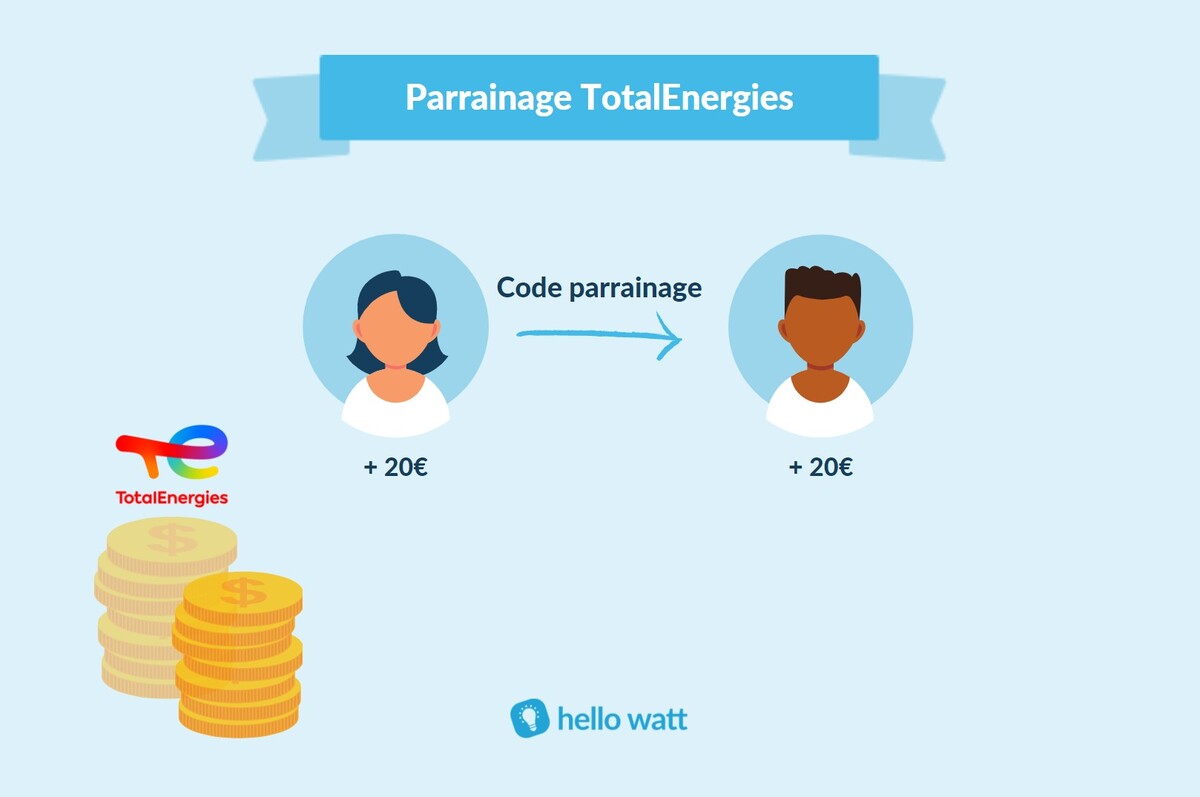 Vous êtes client chez TotalEnergies et souhaitez faire encore plus d’économies sur vos factures d’électricité ou de gaz ? Bonne nouvelle : c’est tout à fait possible grâce au système de parrainage mis en place par le fournisseur ! Sommaire 🤝 Le système de parrainage TotalEnergies 🔎 Comment trouver un code parrainage TotalEnergies ? 💸 Faire davantage d’économies sur sa facture 💬 Foire aux questions 🤝 Le système de parrainage TotalEnergiesCodes promos, cashback, systèmes de parrainage, promotions, etc. Les moyens pour faire des économies sont de plus en plus nombreux. Saviez-vous que ces méthodes sont aussi proposées par les fournisseurs ? Zoom sur le programme de parrainage TotalEnergies.Comment bénéficier du parrainage TotalEnergies ?Que vous soyez un client professionnel ou particulier, vous pouvez bénéficier du système de parrainage TotalEnergies en tant que parrain ou en tant que filleul. Les modalités de participation à ce programme sont simples. Si vous souhaitez souscrire chez TotalEnergies, il vous suffit de rechercher un code parrainage à renseigner lors de votre souscription. Si vous êtes déjà client du fournisseur, il vous suffit de partager votre code avec la ou les personnes de votre choix, peu importe que vous soyez un particulier ou un professionnel.Mais attention, certaines conditions s’appliquent aux parrains participants. S’ils veulent bénéficier de leur réduction, ils doivent remplir les conditions suivantes :ils ne doivent pas avoir d’impayé chez TotalEnergies, ni de retard de paiement ;ils ne doivent pas être placés sous un régime de protection juridique ;ils ne doivent pas avoir demandé la résiliation de leur contrat d’énergie.S’auto-parrainer : c’est possible ?En règle générale, l’auto-parrainage n’est pas admis. Cependant, celui-ci est autorisé lorsque vous souhaitez l’utiliser pour un logement dont le point de raccordement est différent de celui de votre habitation actuelle. Si vous ouvrez une ligne ou que vous changez d'adresse dans le cadre d'un déménagement, par exemple.Quels sont les avantages d’un système de parrainage ?Le système de parrainage de l’ancien fournisseur Total Direct Energie est gagnant-gagnant : il est aussi séduisant pour les parrains que pour les filleuls. Ainsi, il permet à tous les consommateurs d’obtenir des réductions sur leurs factures d’électricité ou de gaz. Concrètement, le parrainage vous donne la possibilité de bénéficier de 20 € de réduction à déduire sur le montant de votre facture. Par ailleurs, en tant que parrain, vous avez l’opportunité de recevoir un bonus en fonction du nombre de personnes que vous parrainez :🤝 Nombre de personnes parrainées💸 Votre bonus en €210 €420 €630 €En revanche, en tant que filleul, vous ne pouvez bénéficier que d’un seul parrainage. Mais une fois client TotalEnergies, vous pouvez vous aussi rejoindre Le Club Parrainage du fournisseur et parrainer quelqu’un afin de cumuler les primes. Sachant que vous pouvez parrainer jusqu’à 20 personnes par an, cela représente jusqu’à 400 € offerts !Dernier avantage de ce système de parrainage : la possibilité de parrainer autant les professionnels que les particuliers. Par ailleurs, en parrainant un professionnel, vous recevrez une prime supplémentaire de 20 €, soit un montant total de 40 € de réductions et, ainsi, la possibilité de faire grimper ses économies jusqu’à 800 € par an. 200 € en 2 minutes C’est en moyenne ce que gagnent nos utilisateurs en changeant simplement de fournisseur d’énergie ! Je compare les offres 🔎 Comment trouver un code parrainage TotalEnergies ?Vous pourriez trouver un code parrainage sur les réseaux sociaux du fournisseur TotalEnergies. De nombreux abonnés y partagent en effet leurs codes parrainages afin de profiter du programme proposé par l’entreprise. Cependant, vous n’êtes pas dans l’obligation de passer par le fournisseur pour trouver un code ! Aujourd’hui, divers forums et sites spécialisés vous permettent de trouver un code promo. Bien sûr, vous pouvez aussi en parler autour de vous et sollicitez vos amis ou votre famille, peut-être seront-ils intéressés. En dernier recours, vous pouvez éavis clients TotalEnergies. Certains utilisateurs y mentionnent le programme de parrainage et seraient susceptibles de partager leur code avec vous.Pour finir, faites bien attention aux arnaques ! Depuis la démocratisation d’internet, celles-ci se sont multipliées. Notez par exemple que vous n’avez pas besoin de fournir vos coordonnées bancaires à un tiers. Pour bénéficier de la réduction, il suffira de communiquer votre code au service client du fournisseur.💸 Faire davantage d’économies sur sa factureTotalEnergies (ex Total Direct Energie) est réputé pour ses offres d’électricité et de gaz avec un prix au kWh avantageux. Ainsi, souscrire un abonnement chez le prestataire devrait vous permettre d’économiser :jusqu’à 10 % avec l’offre Online ;jusqu’à 5 % avec l’offre Classique ;jusqu’à 2 % avec l’offre Verte.En plus de son offre de parrainage, TotalEnergies propose aussi ponctuellement des codes promotionnels, vous permettant également d’obtenir quelques réductions.Et si vous n’êtes pas certain d’avoir fait le meilleur choix pour votre compte en banque ou que vous avez des questions (offres de gaz et d'électricité, déménagement, isolation, entretien chaudière), vous pouvez utiliser un comparateur de fournisseurs d’énergie pour trouver celui qui correspond le mieux à votre profil. Enfin, vous pouvez contacter un conseiller énergie au 09 75 18 60 60 ☎️ du lundi au vendredi de 8h00 à 21h00 et le samedi de 9h00 à 19h00 (numéro non surtaxé). Il vous aidera à trouver le contrat d’énergie idéal pour ne pas trop dépenser.💬 Foire aux questionsQuels sont les avantages et les inconvénients du parraina