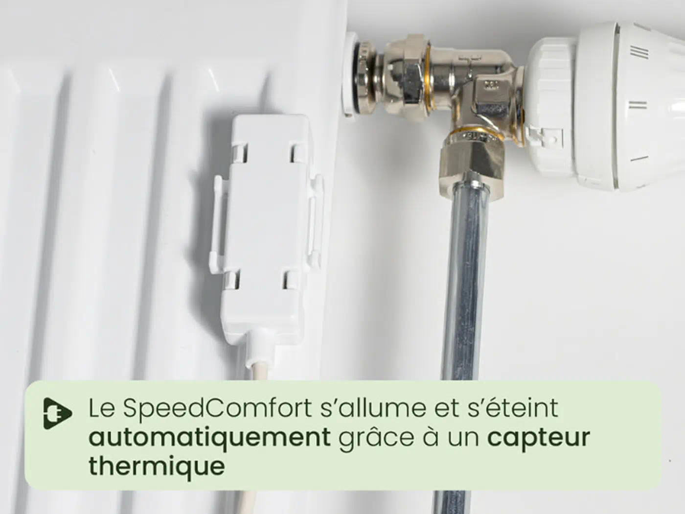 Également magnétique, le capteur de température s’installe au niveau de l'arrivée d'eau chaude (robinet thermostatique), puis vous n’aurez plus qu’à brancher l’adaptateur sur une prise de courant pour commencer à utiliser votre SpeedComfort.