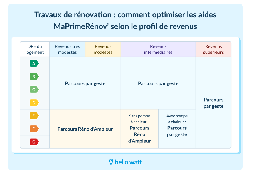 Le prix d’installation d’une pompe à chaleur comprend le coût du matériel (1 500 à 15 000 €) et les frais de pose (10 à 15 % du prix total). Découvrez dans ce guide les tarifs moyens pour chaque type de pompe à chaleur en 2026 ! En résumé Le prix d’installation d’une pompe à chaleur se décompose en 2 postes : le prix de la PAC : 1 500 à 15 000 € en moyenne selon le type d’appareil ; le tarif de pose : 10 à 15 % du coût total. Le prix d’installation d’une pompe à chaleur tout compris (matériel + pose) pour un logement de 100 m² atteint : 6 000 à 9 000 € pour une PAC air-air ; 9 000 à 13 000 € pour une PAC air-eau ; 8 000 à 18 500 € pour une PAC eau-eau ; 10 000 à 20 000 € pour une PAC sol-sol ou sol-eau. Sommaire Quel est le prix d’installation d’une pompe à chaleur en 2026 ? Quel est le prix d’installation d’une pompe à chaleur selon la surface du logement ? Quels facteurs impactent le prix d’installation d’une pompe à chaleur ? Comment optimiser la rentabilité de sa pompe à chaleur ? Quelles sont les aides disponibles pour réduire le prix d’installation d’une PAC ? FAQ : vos questions sur le prix d’une installation de PAC Quel est le prix d’installation d’une pompe à chaleur en 2026 ? Le prix d’installation d’une pompe à chaleur tout compris en 2026 Voici un tableau récapitulatif des prix moyens pour l’installation d’une pompe à chaleur en fonction du type d’équipement, comprenant le coût du matériel et les frais d’installation : Type de pompe à chaleur Coût au m² Air-air 60 à 90 €/m² Air-eau 90 à 130 €/m² Eau-eau 80 à 185 €/m² Sol-sol et sol-eau 100 à 200 €/m² Faites des économies avec Hello Watt ! Avec Hello Watt, profitez de tarifs négociés et d’installateurs certifiés RGE pour une pose fiable et économique. Matériel et pose, comptez par exemple : 11 105 € pour la PAC air-eau 11 kW Atlantic Alféa Excellia A.I (chauffage seul) ; 14 491 € pour la PAC air-eau 8 kW Mitsubishi Electric Ecodan Power Inverter Silence R32 Duo (chauffage + ECS) ; 13 497 € pour la PAC air-eau 6 kW Daikin Altherma 3R Duo (chauffage + ECS). Vous souhaitez installer une pompe à chaleur ? Calculez le montant de vos aides et obtenez un devis gratuit en 2 minutes. Installer une pompe à chaleur Le coût d’une pompe à chaleur hors pose en 2026 Le prix du matériel seul (sans la main-d'œuvre) varie de : 1 500 à 5 000 € pour une PAC air-air ; 7 000 à 13 000 € pour une PAC air-eau ; 10 000 à 15 000 € pour une PAC eau-eau ; 10 000 à 15 000 € pour une PAC sol-sol ou sol-eau. Notez cependant que l'installation par un professionnel RGE (Reconnu Garant de l’Environnement) est indispensable pour garantir la sécurité du système et le bénéfice des aides financières. Le tarif de pose d’une pompe à chaleur en 2026 Le coût de la pose d’une pompe à chaleur représente en général entre 10 et 15 % du montant du devis total, mais il peut varier selon les tarifs pratiqués par l’installateur. Le conseil des experts Hello Watt Faites réaliser au moins 3 demandes de devis auprès d’entreprises différentes pour comparer les prestations et choisir l’offre au meilleur rapport qualité/prix. Quel est le prix d’installation d’une pompe à chaleur selon la surface du logement ? Prix d’installation pompe à chaleur dans une maison de 100 m² Type de pompe à chaleur Prix installation logement 100 m² (fourniture + pose) Air-air 6 000 à 9 000 € Air-eau 9 000 à 13 000 € Eau-eau 8 000 à 18 500 € Sol-sol et sol-eau 10 000 à 20 000 € Prix d’installation pompe à chaleur dans une maison de 120 m² Type de pompe à chaleur Prix installation logement 120 m² (fourniture + pose) Air-air 7 200 à 10 800 € Air-eau 10 800 à 15 600 € Eau-eau 9 600 à 22 200 € Sol-sol et sol-eau 12 000 à 24 000 € Prix d’installation pompe à chaleur dans une maison de 200 m² Type de pompe à chaleur Prix installation logement 200 m² (fourniture + pose) Air-air 12 000 à 18 000 € Air-eau 18 000 à 26 000 € Eau-eau 16 000 à 37 000 € Sol-sol et sol-eau 20 000 à 40 000 € Quels facteurs impactent le prix d’installation d’une pompe à chaleur ? Le type de pompe à chaleur Le montant du devis dépend du type de pompe à chaleur et de la complexité de son installation. Par exemple : PAC aérothermiques (air-air et air-eau) : entre 60 et 130 €/m² pose comprise car ce sont les plus faciles à installer ; PAC hydrothermiques (eau-eau) et géothermiques (sol-eau et sol-sol) : 80 à 200 €/m² pose comprise, car elles nécessitent l’installation de capteurs enfouis verticaux (entre 15 000 et 20 000 €) ou horizontaux (entre 10 000 et 18 000 €) ; PAC sans production d’eau chaude sanitaire (ECS) : 12 500 € en moyenne pose comprise ; PAC avec production d’ECS : 15 000 voire jusqu’à 20 000 € en moyenne pose comprise ; PAC haute température : plus coûteuses que les PAC basse température, car plus performantes (chauffent l’eau entre 55 et 65 °C contre 35 et 40 °C). Comment fonctionne une PAC ? Pour fonctionner, la PAC capte la chaleur de l’air, du sol ou de l’eau grâce à son unité extérieure et la transfère dans votre logement via les unités intérieures (ou splits). Les autres critères qui influencent le prix d’une pompe à chaleur D’autres paramètres font varier le prix d’installation d’une pompe à chaleur : la puissance liée à la surface à chauffer ; le nombre d’unités intérieures pour un système multisplit ; le niveau de performance ; la marque et la qualité du matériel (privilégiez les modèles certifiés NF PAC) ; les options et accessoires (protection d’unité extérieure, réversibilité, ballon tampon, couplage panneaux solaires, contrôle à distance, etc.) ; les frais de déplacement de l’installateur ; l’installation des émetteurs (plancher chauffant, de radiateurs ou de ventilo-convecteurs) dans un lo