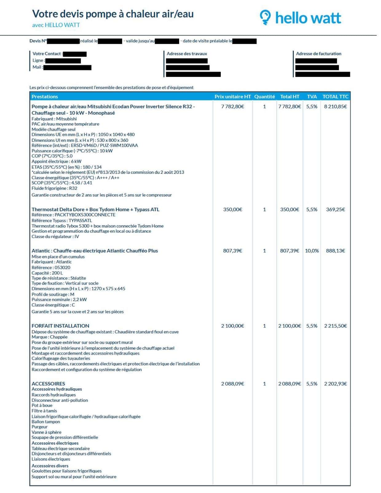 Voici un exemple de devis complet réalisé par Hello Watt pour l‘installation d’une pompe à chaleur air-eau Mitsubishi Ecodan Power inverter Silence R32 - Chauffage seul - 10 kW - Monophasé :