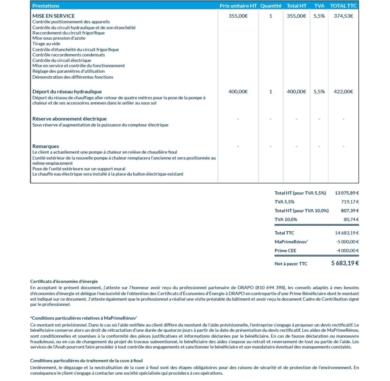 Exemple de devis pour une pompe à chaleur air-eau